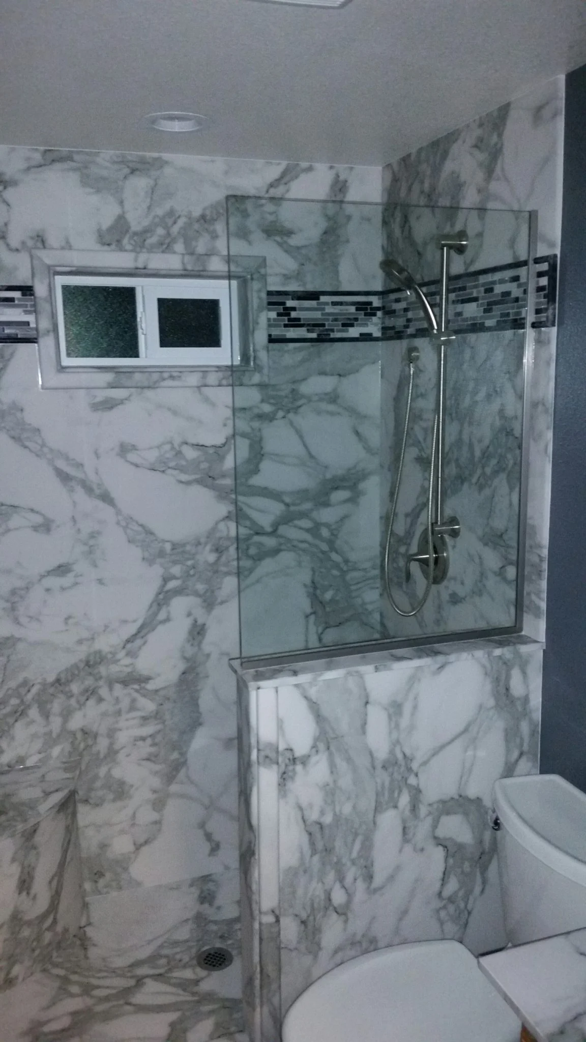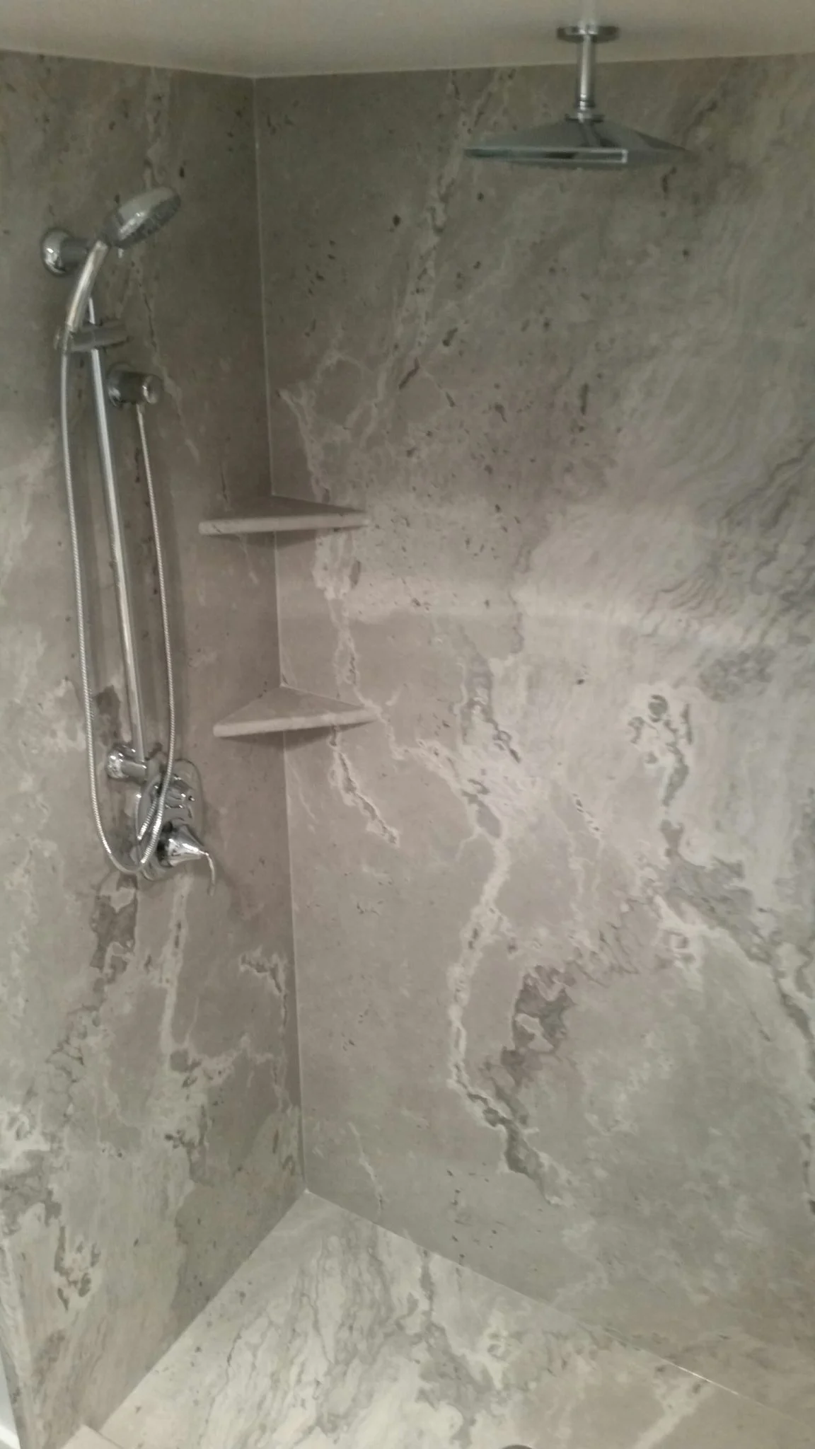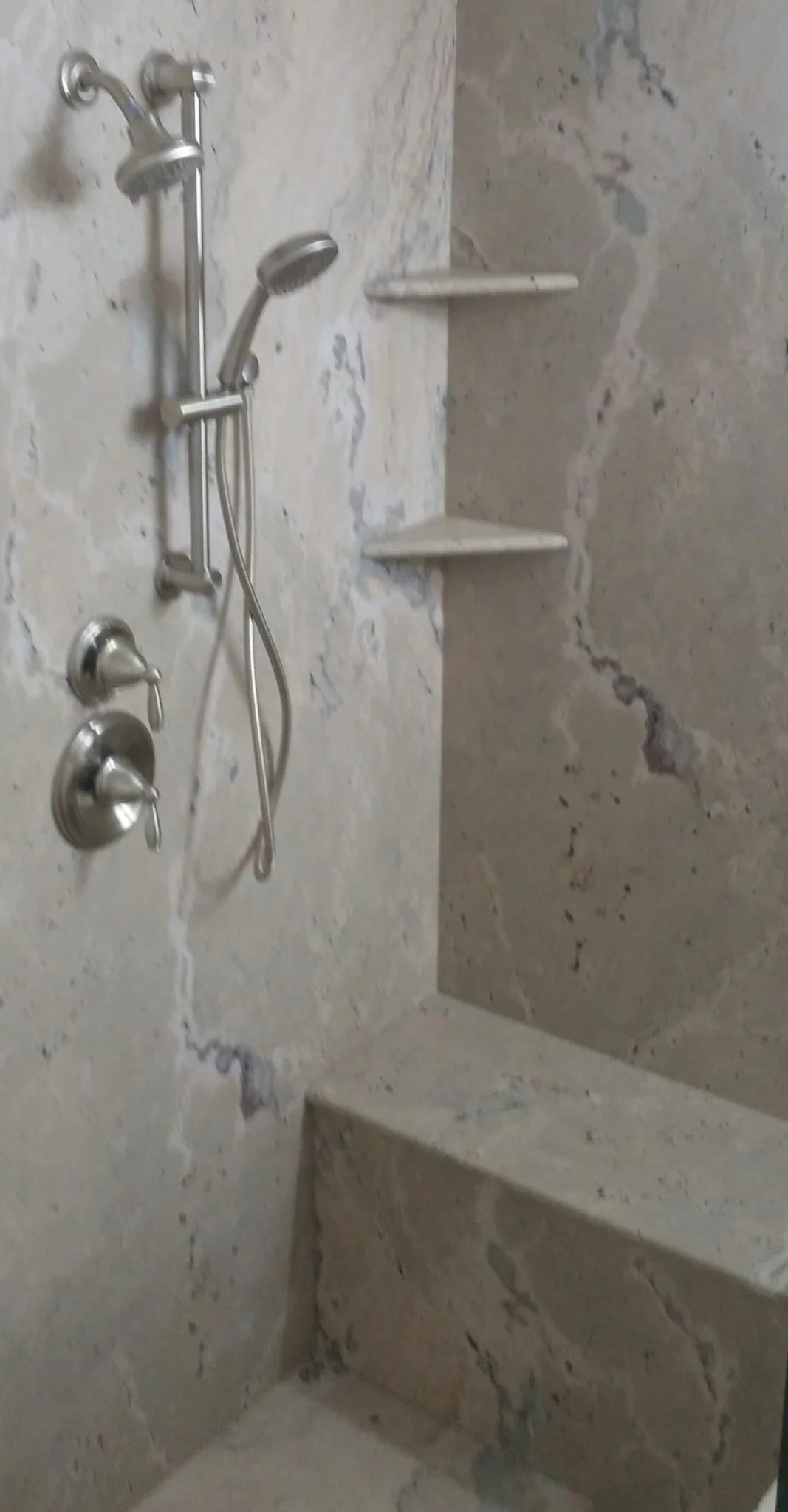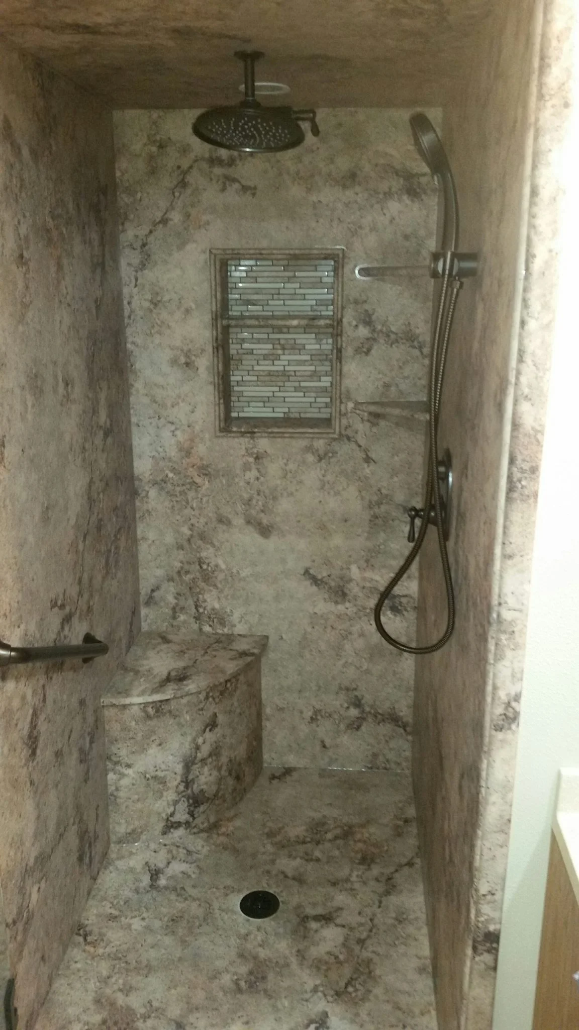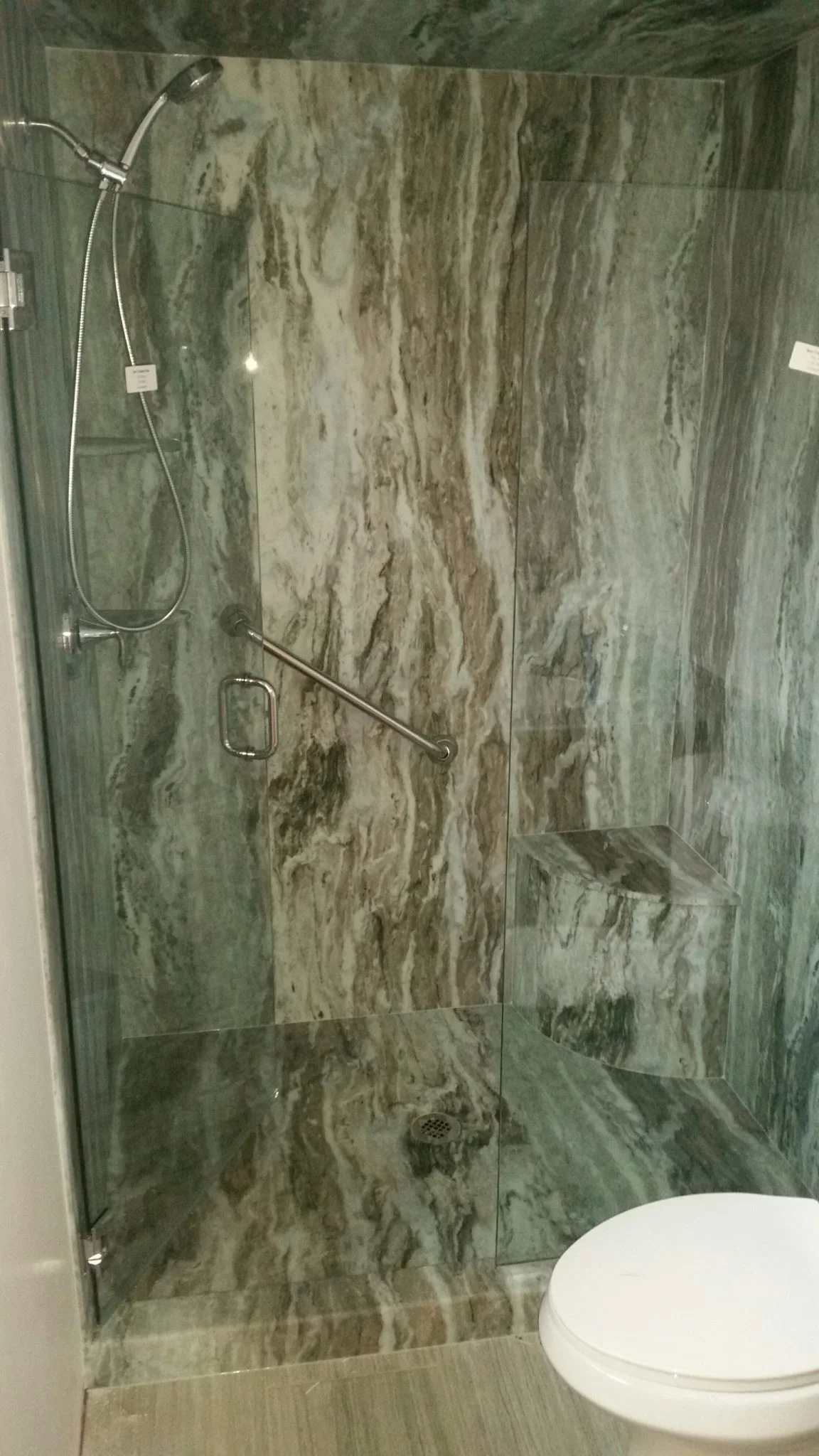Our services include: Custom showers, tub surrounds, vanity tops, back splashes, tub decks, skirts, corner seats, bench seats, recess shelving, corner shelves, kitchen back splashes, and counter tops.