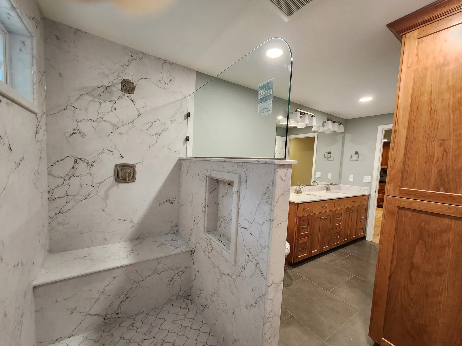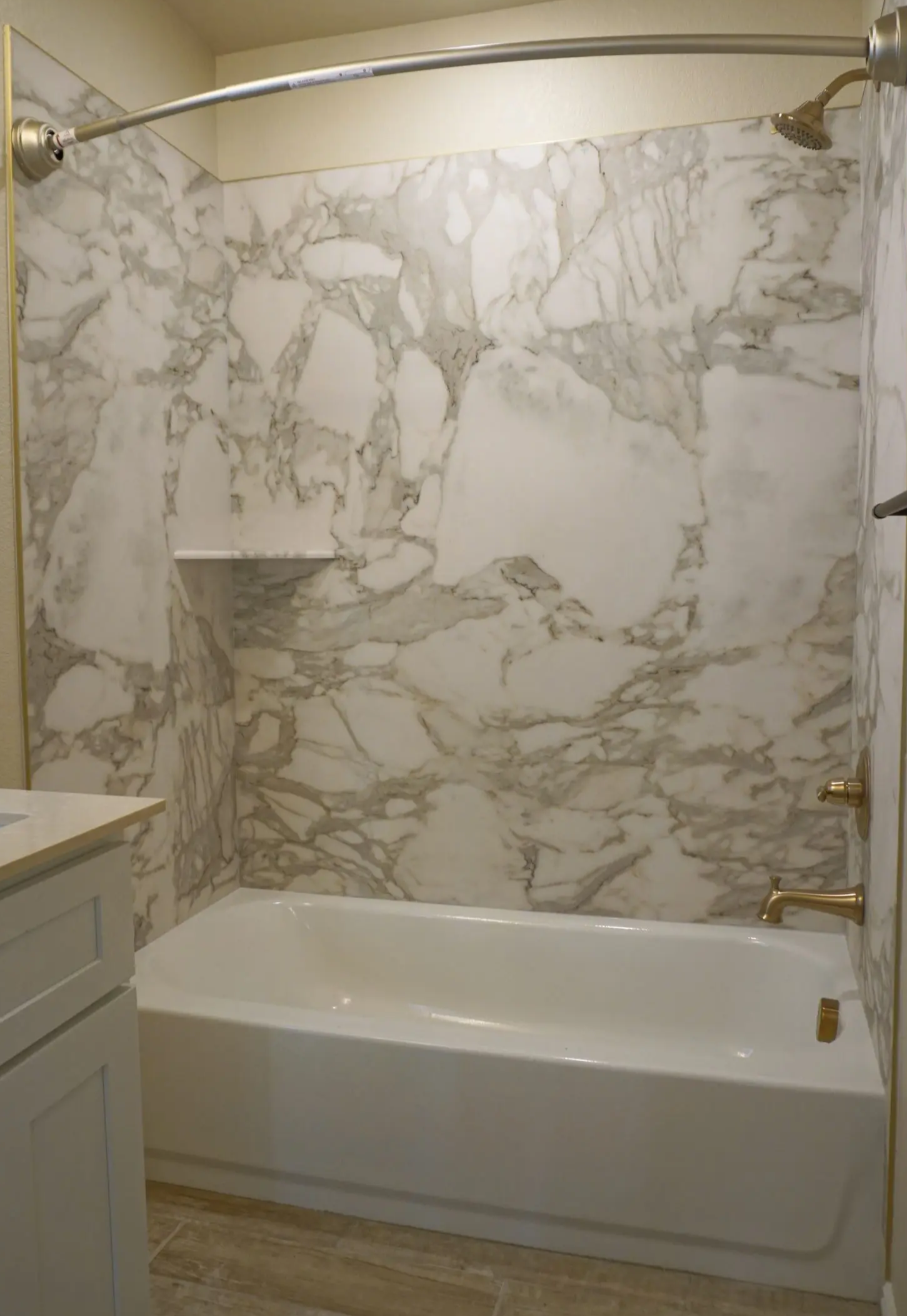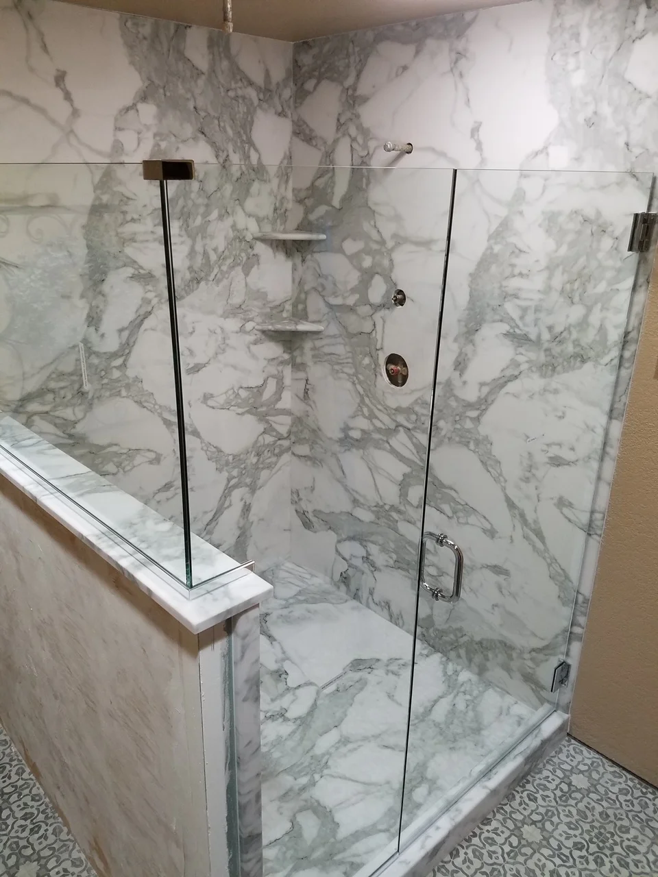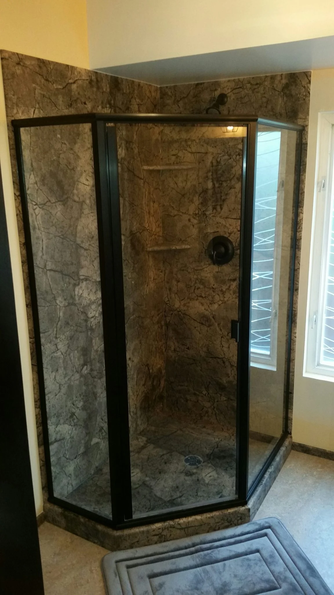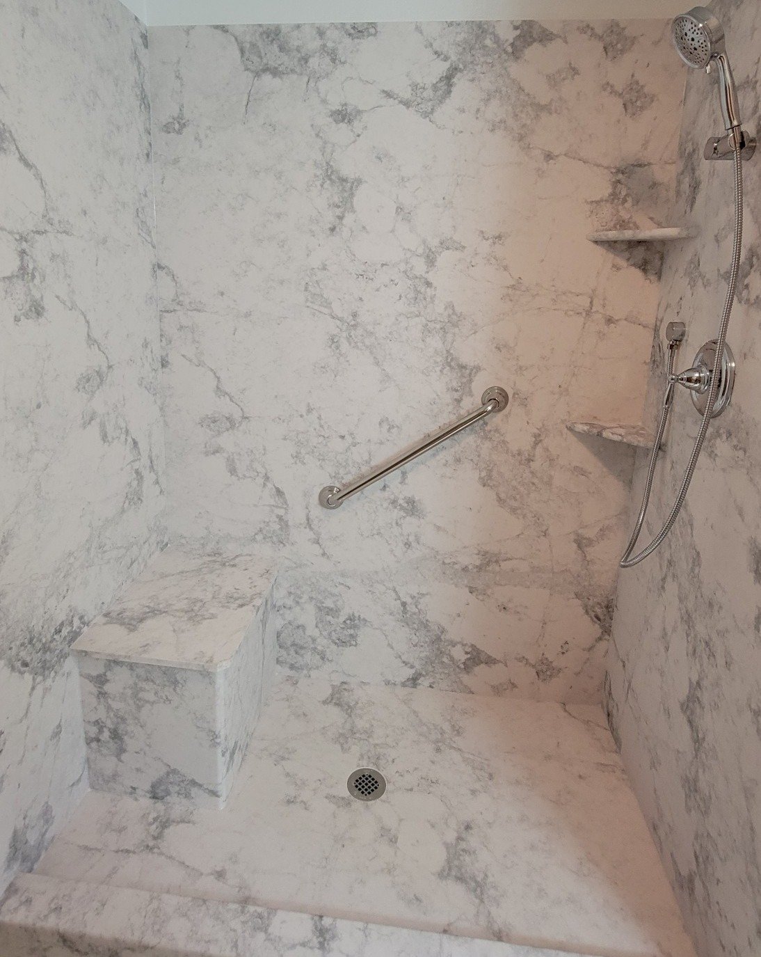 Our services include: Custom showers, tub surrounds, vanity tops, back splashes, tub decks, skirts, corner seats, bench seats, recess shelving, corner shelves, kitchen back splashes, and counter tops.